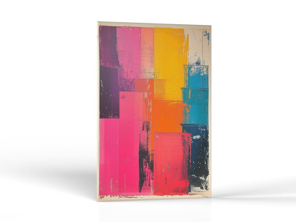Obrázok je zoskupením hrubých, vertikálnych a horizontálnych ťahov štetcom, ktoré vytvárajú farebné bloky v odtieňoch ružovej, fialovej, oranžovej a modrej. Škvrny a kvapky farby pridávajú na spontánnosti a textúre kompozície. Celkový výsledok je živý a energický, s výrazným vizuálnym dopadom.