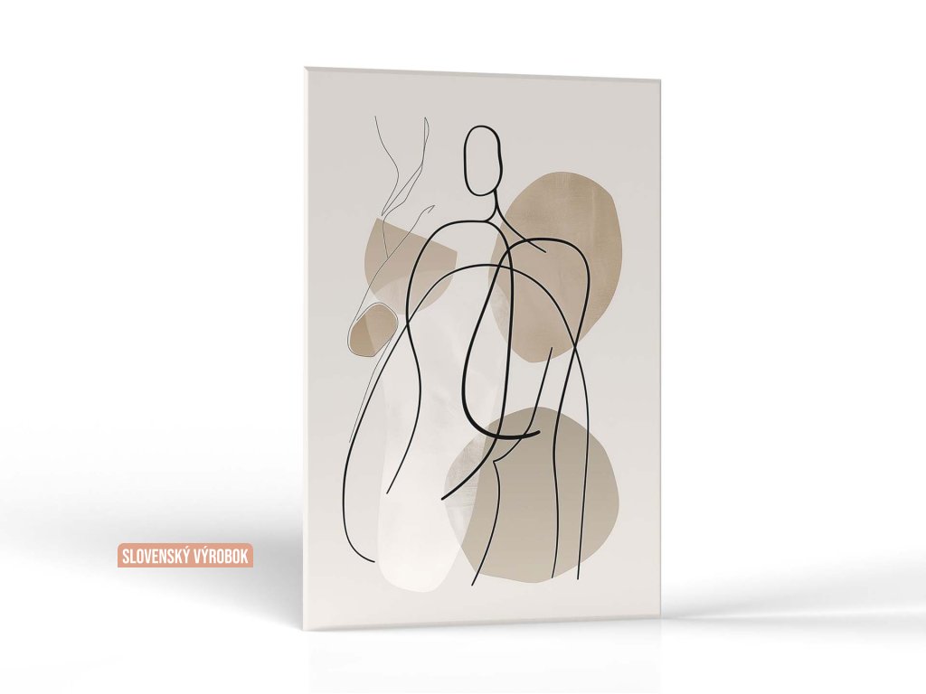 Tento obraz zobrazuje abstraktnú postavu vytvorenú pomocou jemných čiernych línií, ktoré sú doplnené rôznymi geometrickými tvarmi v neutrálnych odtieňoch hnedej a béžovej farby. Celkový dizajn má minimalistický a moderný charakter, ktorý vyvoláva pocit elegancie a jednoduchosti. Ilustrácia sa hodí ako umelecký prvok do interiérov, ktoré preferujú čisté línie a subtílne farebné palety.