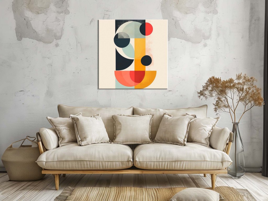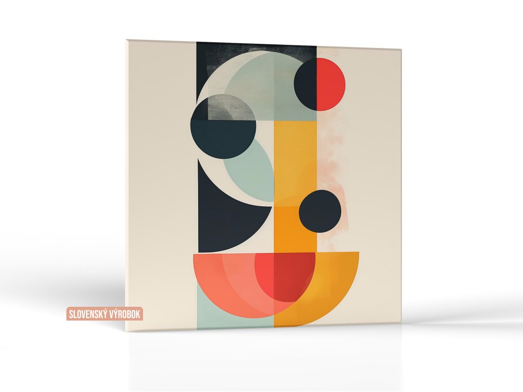 Tento obraz zobrazuje rôzne geometrické tvary ako kruhy a polkruhy, ktoré sú zložené v atraktívnom a farebnom vzore. Obraz používa zmes teplých a chladných tónov, vrátane čiernej, bielej, červenej a pastelovej zelenej, čo vytvára vizuálne pôsobivú paletu. Celkový vzhľad je moderný a minimalizmus prvkov a farieb vytvára esteticky príjemný obraz vhodný pre súčasné interiéry.
