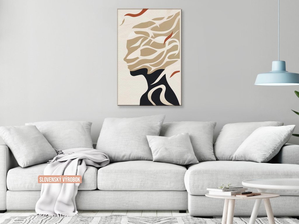 Na obrázku je zobrazený abstraktný bočný profil ľudskej postavy, štylizovaný do jednoduchých a plynulých tvarov. Dominantné farby obrazu sú odtiene béžovej, okrovej a čiernej, s výraznými akcentmi červenej. Profil je vyjadrený bez detailných rysov, čo dáva dielu minimalistický a moderný vzhľad. Vlasy a kontúry tváre sú znázornené pomocou spojených a oddelených kriviek, čo vytvára dynamický a pohyblivý efekt.