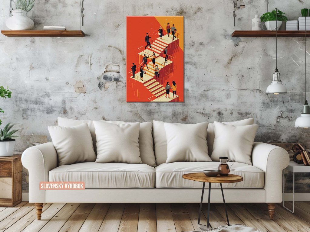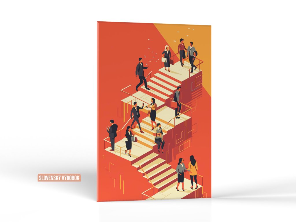 Na obraze vidíme skupinu ľudí v biznis oblečení, ktorí kráčajú hore a dolu po moderných schodoch, pričom komunikujú a vykonávajú svoje denné povinnosti. Každá postava je zaneprázdnená, niektorí si podávajú ruky, iní telefonujú alebo nesú dokumenty. Pozadie je minimalistické, s teplými farbami, ktoré dodávajú dynamiku a energiu celkovej scéne. Kompozícia symbolizuje neustály pohyb a interakciu v biznis prostredí, kde každý krok smeruje k úspechu.
