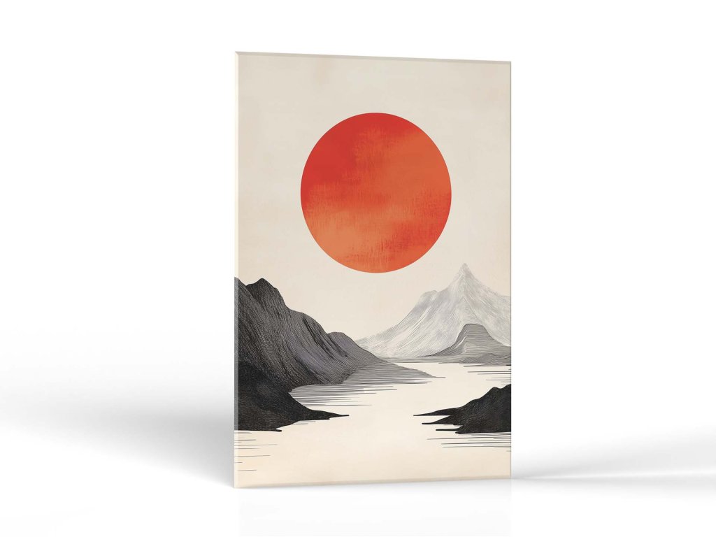 Minimalistická krajina s dominantným červeným slnkom nad horami.