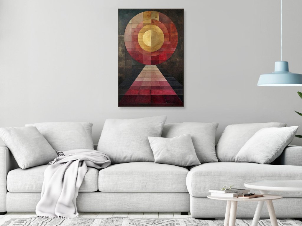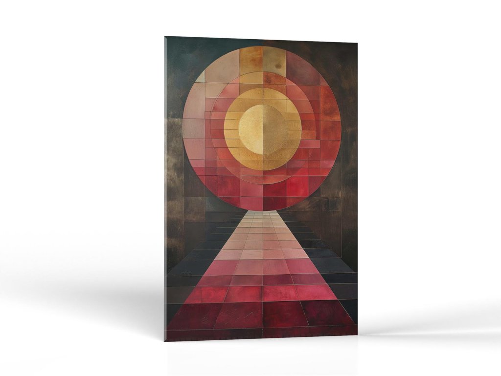 Obrázok predstavuje slnko umiestnené v strede kompozície so žiariacimi prstencami, ktoré prechádzajú cez strednú cestu vedúcu k divákovi. Výtvarné prvky sú zobrazené v teplých tónoch červenej, oranžovej a žltej farby, ktoré sú v kontraste s tmavými odtieňmi na okrajoch. Cesta zdôrazňuje hĺbku a vedie k centrálnemu bodu, čím vytvára ilúziu trojrozmernosti.