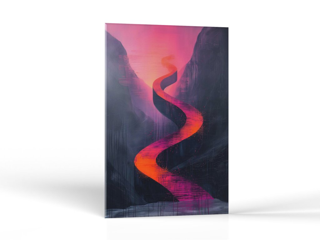 Tento obraz predstavuje abstraktnú krajinu, kde sa oranžová, vlniaca sa cesta vinie stredom medzi tmavými, tajomnými útesmi. Dynamické ťahy štetcom a kvapky farby na obraze vytvárajú dojem pohybu a energie. Zmes teplých a studených tónov dodáva hĺbku a kontrast, čo naznačuje hĺbku a nekonečnú cestu.
