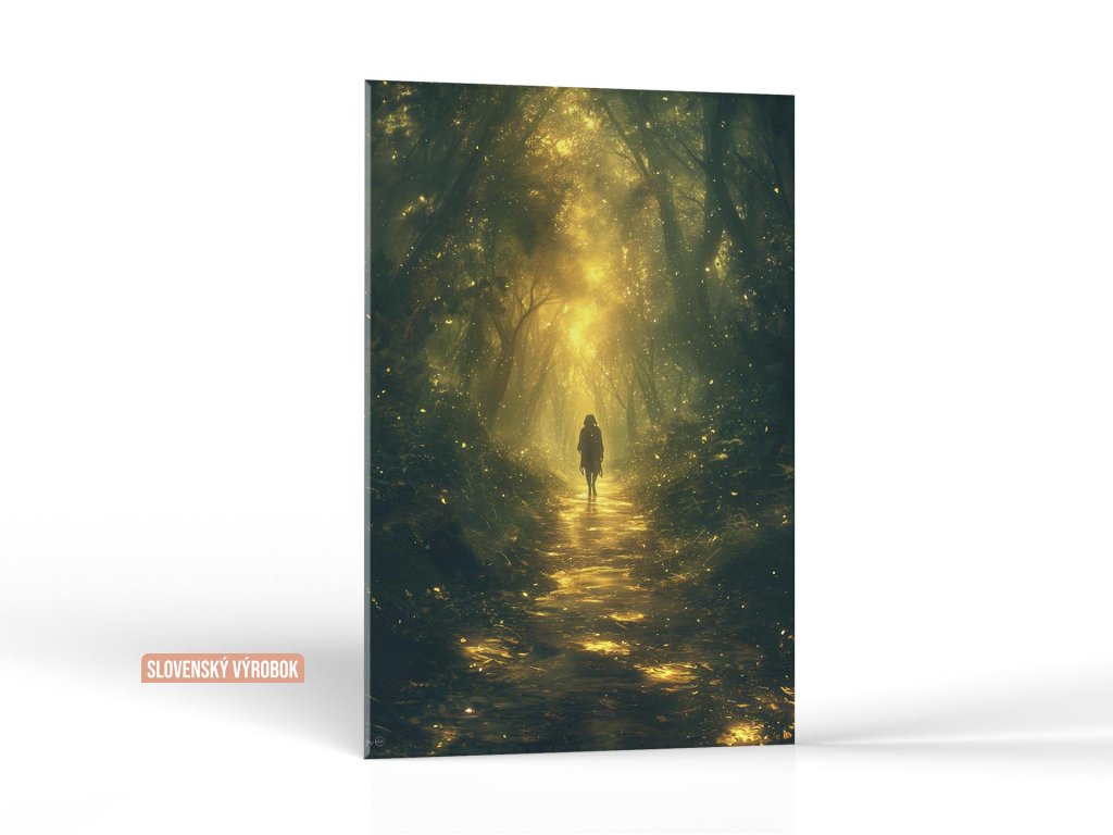 Na tomto pôsobivom obraze je zachytená postava vstupujúca do záhadného lesa, kde cesta a okolitá vegetácia sú osvetlené jasným, zlatistým svetlom, vytvárajúcim dojem magického prostredia. Svetielka vo vzduchu pripomínajú tajomné iskry alebo plávajúci prach, čo umocňuje atmosféru neopísateľného kúzla a ticha.