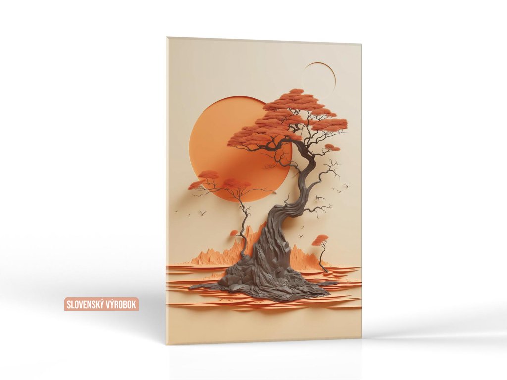 Na obraze je vyobrazený majestátny strom s oranžovými listami, ktorý sa týči nad abstraktnou krajinou, s veľkým oranžovým slnkom v pozadí a menším bielym slnkom v hornom rohu. Tento strom sa vinie nad štylizovanou hradbou hôr, zatiaľ čo jeho listy a vetvy sú zvýraznené proti dvojitým slnkom. Obraz pôsobí pokojne a harmonicky, pričom farby a kompozícia evokujú pocit večnej obnovy prírody.