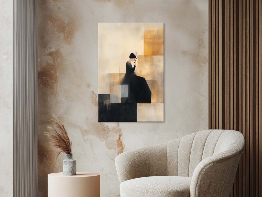 Obraz zobrazuje ženu v čiernych šatách, ako sedí v zamyslenej póze s hlavou jemne sklonenou. Tón obrazu je tlmený, v odtieňoch béžovej, sivej a čiernej, čo vytvára pokoj a introspektívnu náladu. Geometrické pozadie kontrastuje s jemnosťou postavy, čím ešte viac zvýrazňuje jej vnútorný svet a melancholickú krásu chvíle.