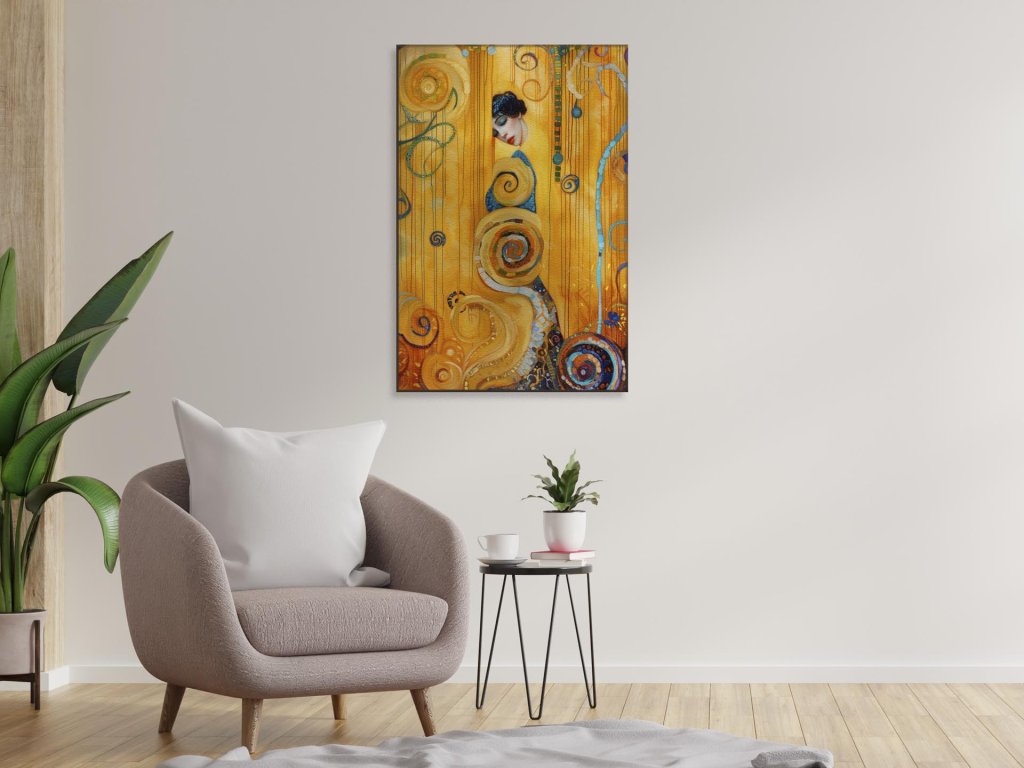 Obraz predstavuje elegantnú ženu so zavretými očami, obklopenú zlatou farbou a s bohatými ornamentmi. Na pozadí dominujú zlaté a modré kruhové vzory, ktoré vytvárajú ilúziu hĺbky a pohybu. Umelecké dielo pripomína modernú interpretáciu secesných štýlov s využitím jasných farieb a komplexných vzorov.