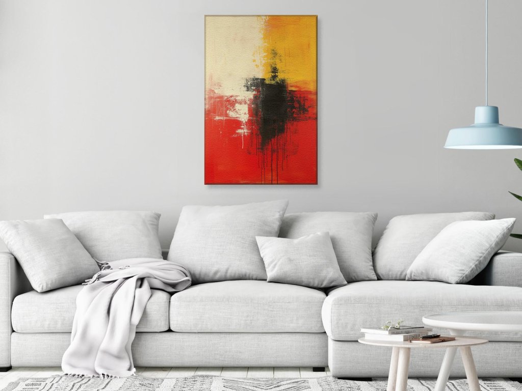 Tento obrázok predstavuje dynamický kontrast medzi horúcimi a chladnými tónmi, s dominujúcim červeným a žltým podkladom, preťatým hrubým čiernym pásom. Škvrny a kvapky farby dodávajú textúru a hĺbku, zatiaľ čo biela a čierna vrstva na vrchu a spodku vytvárajú pocit rozmanitosti a neusporiadanosti. Celkový dojem je dráma a energická vášeň, ktorá sa prelína s tichým zamyslením.