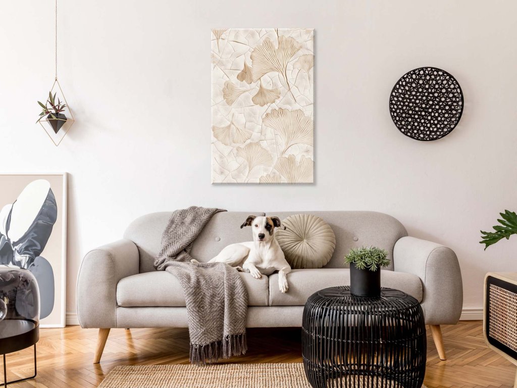 Tento obraz evokuje reliéfnu ilustráciu delikátnych listov v jemných béžových odtieňoch na svetlom pozadí. Detaily listov sú precízne vykreslené, čo dodáva obrazu hĺbku a textúru. Kompozícia pôsobí elegantne a jemne, čím prináša do interiéru sofistikovanú a pokojnú prírodnú atmosféru.
