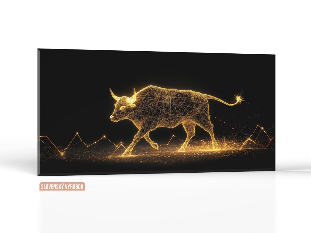 Žiariaci býk zložený z digitálnych línií kráča naprieč tmavým priestorom so symbolmi rastu.