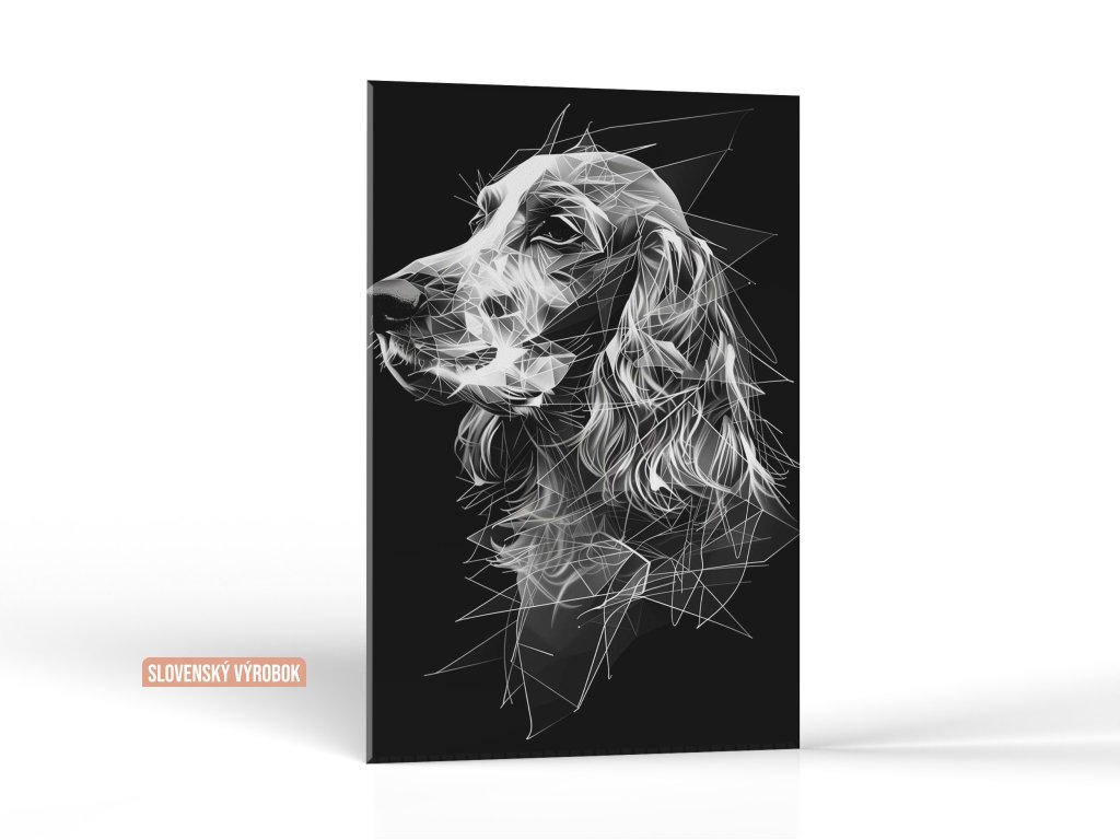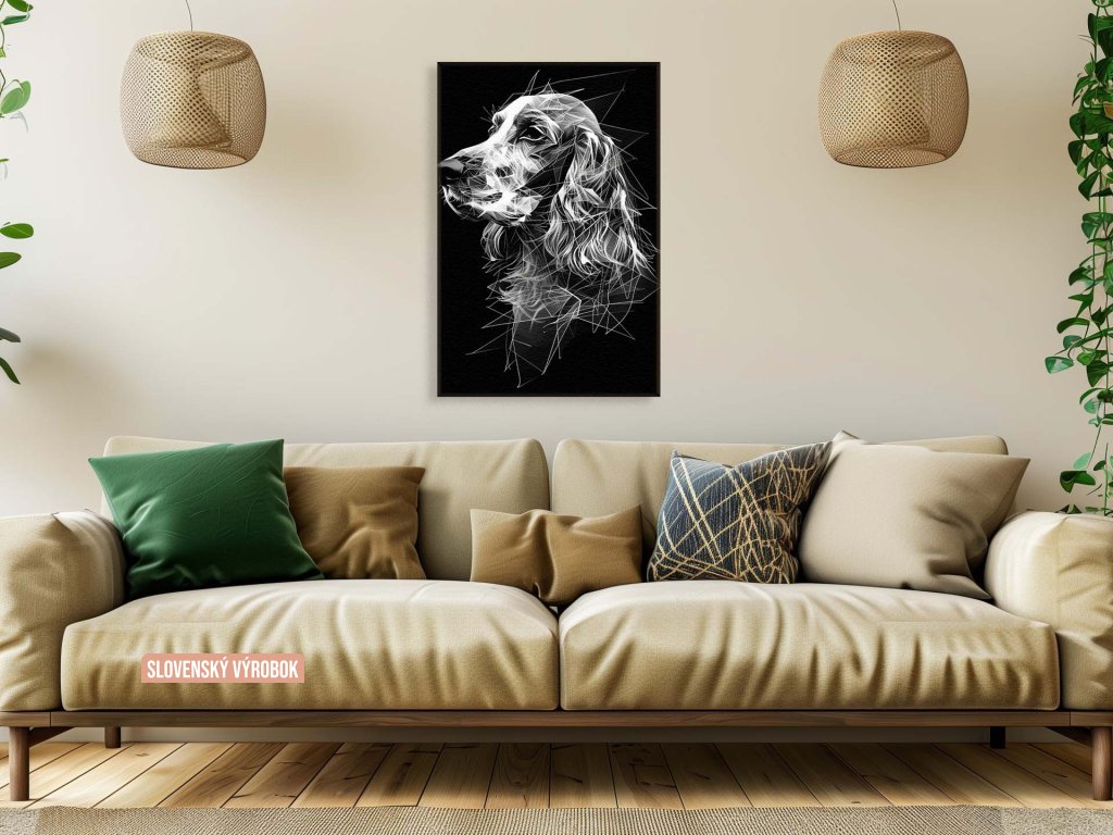 Tento obraz zobrazuje portrét psa v štýle nízkopolygónového umenia, kde svetlo a tieň sú zachytené pomocou ostrých bielych línií na čiernom pozadí. Tvorba poukazuje na dynamický kontrast a hĺbku prostredníctvom prelínania geometrických tvarov, ktoré imitujú srsť a črty psa. Vizuálny efekt je moderný a abstraktný, s výrazným využitím tmavého priestoru.