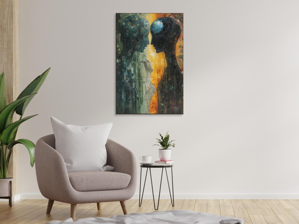 Na obraze sú zobrazené dve abstraktné postavy s hlavami zdobenými kruhovými mozaikami rôznych farieb, ktoré kontrastujú na pozadí prechádzajúcim z tmavých zelených odtieňov do teplých oranžových a žltých tónov. Vytvárajú dojem hlbokého priestoru a komplexnosti, zatiaľ čo ich prsty sa jemne dotýkajú v geste, ktoré môže naznačovať ľudské spojenie alebo komunikáciu. Celkový dojem je tajomný a ladený do prírodných farieb s nádychom technologickej estetiky.