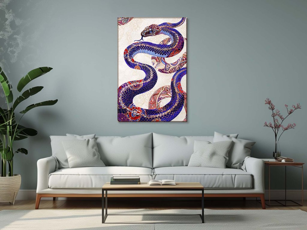 Na obraze je zobrazený had s výraznou modrou farbou tela, doplnený o bohaté vzory a oranžové akcenty, ktoré dotvárajú ilúziu lesku a hĺbky jeho šupín. Pozadie s nežnými odtieňmi a jemnými vzormi kontrastuje s dominujúcou prítomnosťou hada a zvýrazňuje jeho elegantné krivky a pohyb.