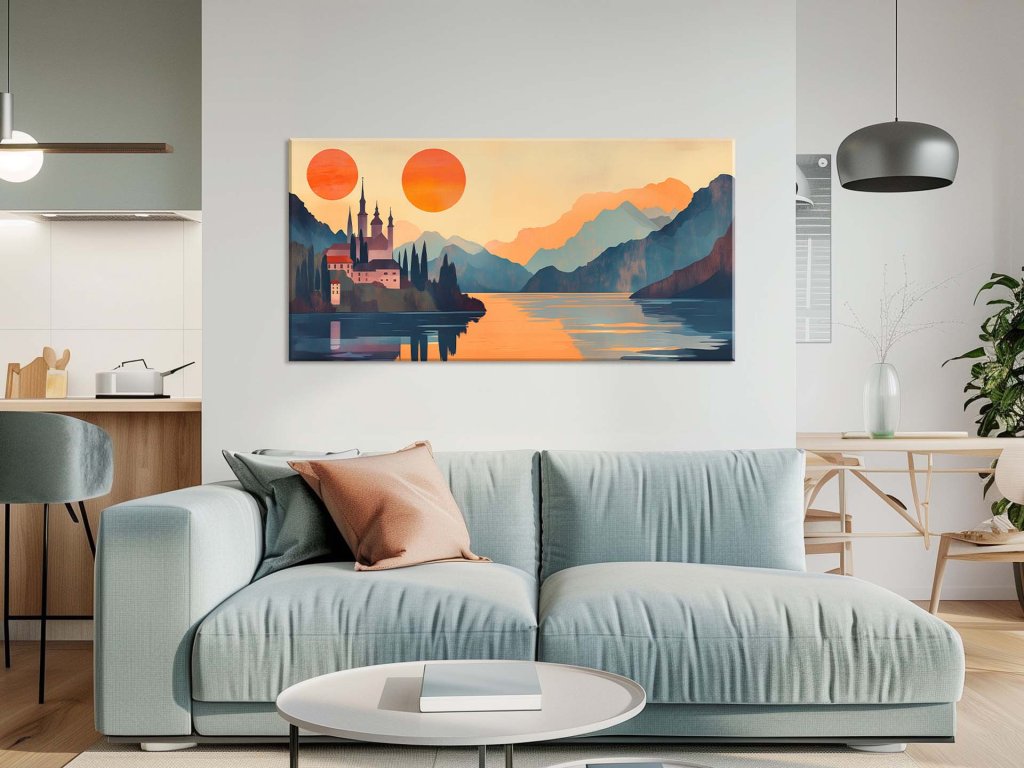 Tento obraz zachytáva tichú, surrealistickú krajinu s dvoma veľkými oranžovými slnkami, ktoré osvetľujú zámok postavený na brehu jazera. Jazero zrkadlí teplé odtiene západu slnka, zatiaľ čo tmavé hory v pozadí vytvárajú kontrast voči svetlej oblohe. Celková atmosféra obrazu je pokojná, s nádychom tajomna, pripomínajúca svet zo snov.
