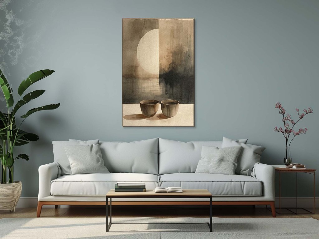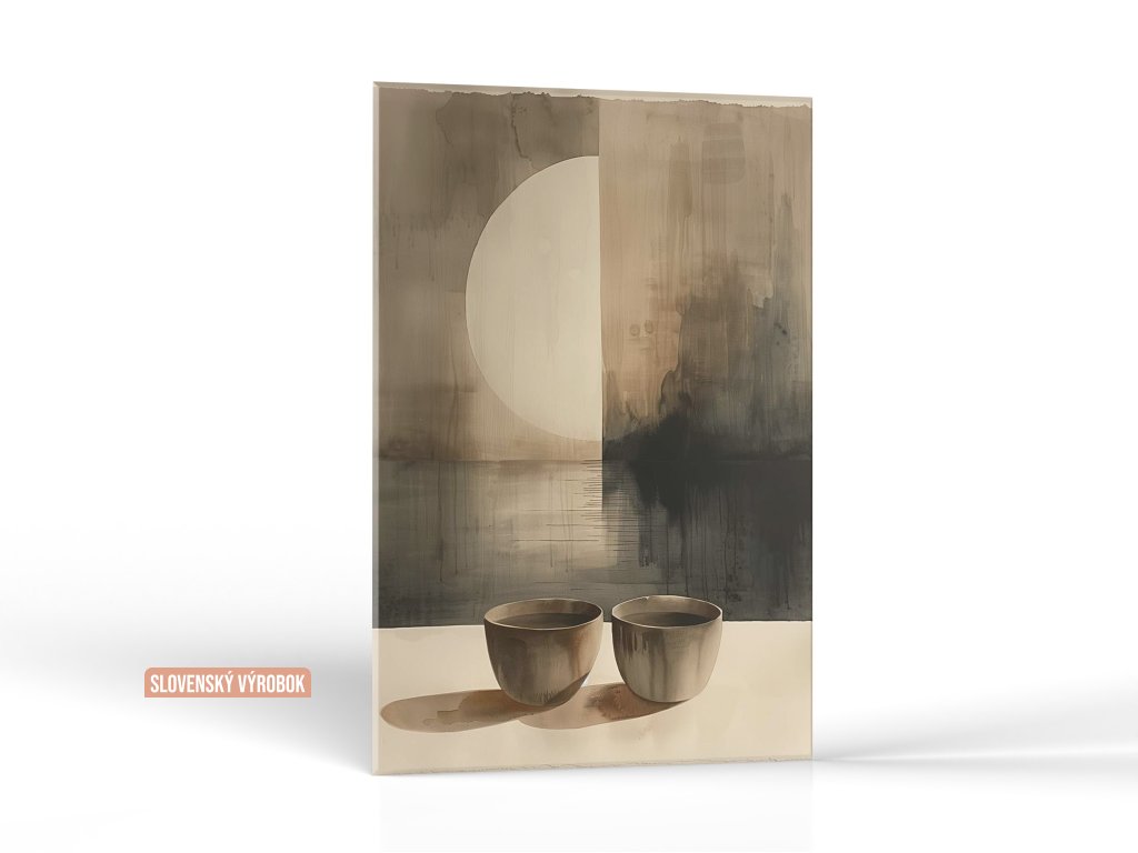 Na obraze sú zobrazené dve hnedé misky na prednej ploche s veľkým bielym kruhom a abstraktnými tmavými tónmi v pozadí. Misky odrážajú svetlo a tieň, čím vytvárajú pocit hĺbky a priestoru. Použitie monochromatického odtieňa spolu s abstraktným pozadím a jednoduchými tvarmi dodáva dielu minimalistický charakter.