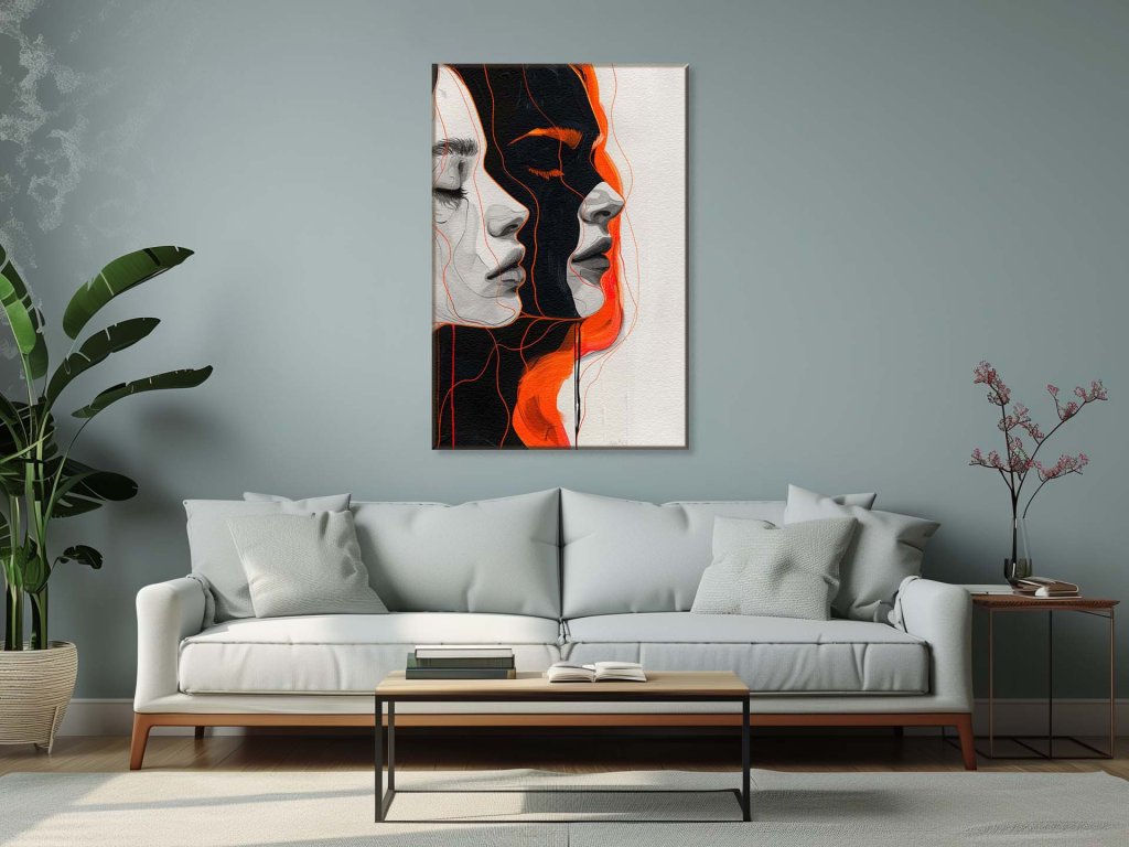 Obraz predstavuje zložité prepojenie dvoch tvárí, kde dominantné oranžové a čierne línie vytvárajú kontúry. Na pozadí sú naznačené ďalšie tváre, čo dodáva dielu hĺbku a komplexnosť. Výrazné oranžové akcenty a jemné škvrny dodávajú dynamiku a emocionálnu silu portrétu.