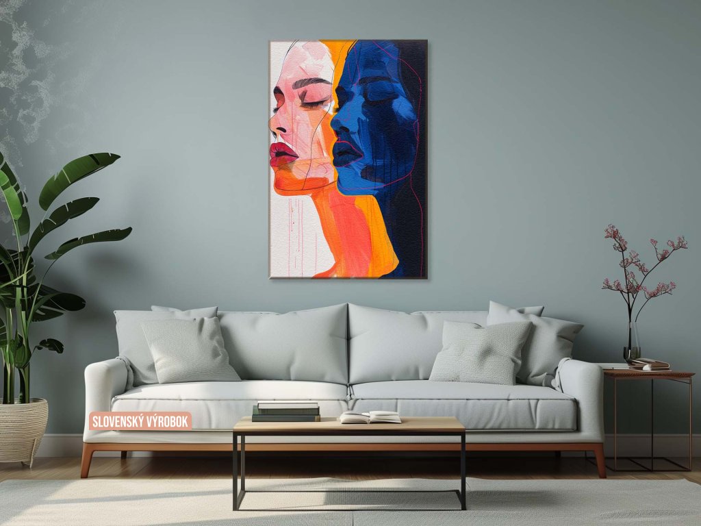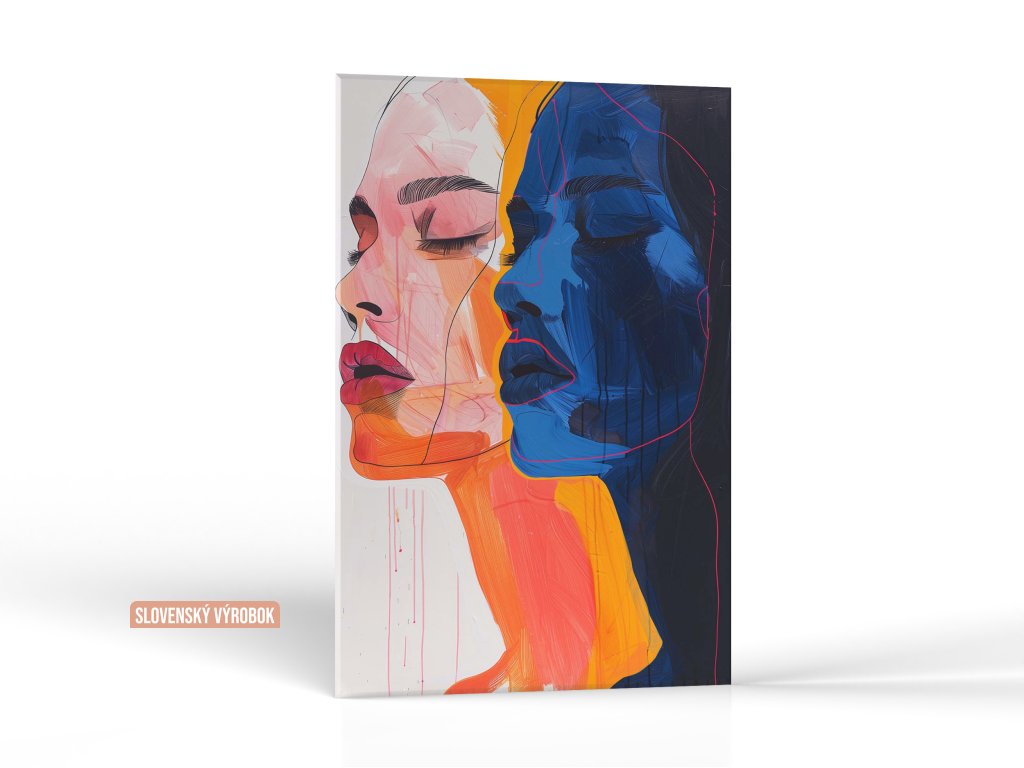 Na obraze sú zobrazené dve tváre, jedna v teplých oranžových a druhá v chladných modrých odtieňoch, s črtami definovanými živými červenými líniami. Obe tváre sú naklonené smerom k sebe a zdá sa, že sú v pokojnom a meditatívnom stave, čo vytvára pocit harmónie a rovnováhy. Zadné pozadie je neutrálne a umožňuje, aby sa farby a tvary v popredí plne vynímali.