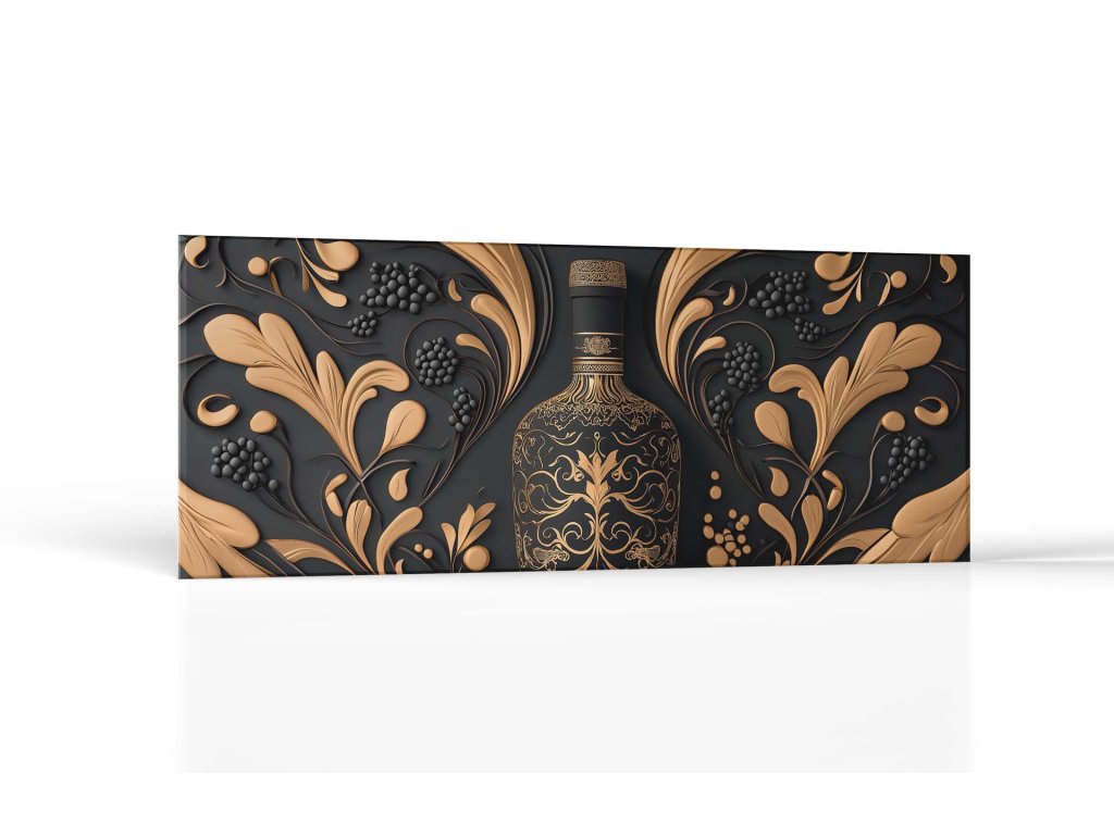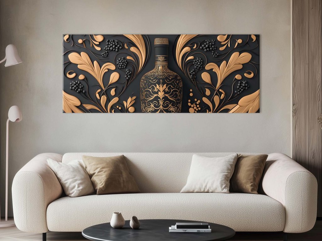 Tento obraz zachytáva krásne zdobenú fľašu vína s elegantnými zlatými ornamentmi na tmavom pozadí, ktoré vytvárajú kontrast a sofistikovanosť. Zlaté listy a strapce hrozna rámujú fľašu, čo pripomína umenie a remeselnú precíznosť. Detailné vzory zdôrazňujú luxus a eleganciu, pričom celý obraz pôsobí majestátne a vznešene.