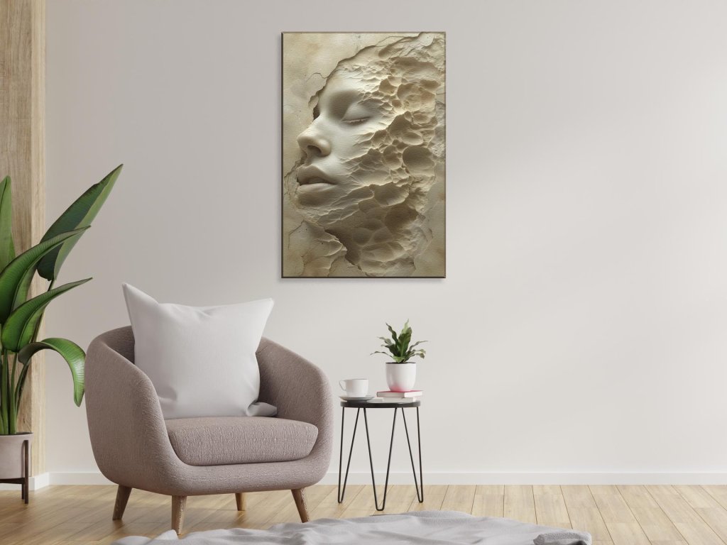 Na obraze je zobrazená ženská tvár so zatvorenými očami, ktorá sa zlúčila s textúrou erodovanej krajiny. Vizuálny efekt pripomína pieskové duny alebo skalnatú krajinu, ktoré sa stávajú súčasťou jej čŕt. Celková paleta a štýl obrazu vyvolávajú pocit ticha a kontemplácie nad pomíjajúcim časom.