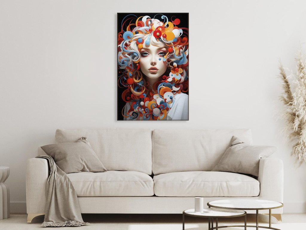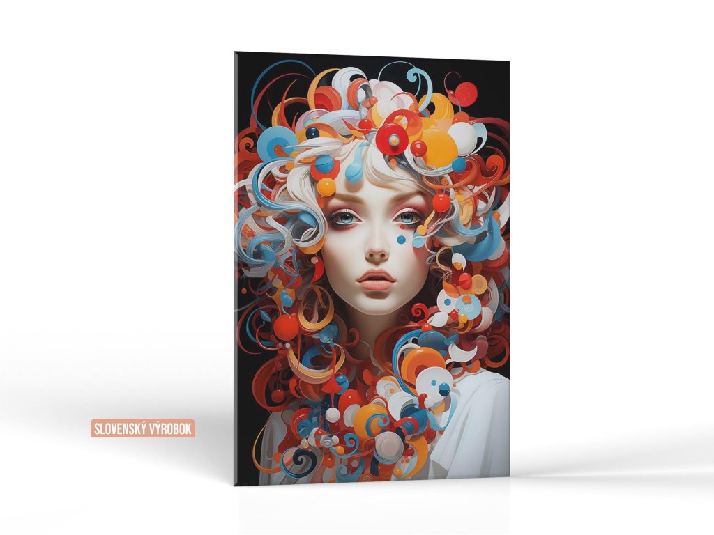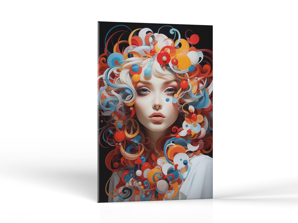 Na obraze je žena s bielymi vlasmi, ktoré sa spájajú s hravými abstraktnými tvarmi a žiarivými farbami, vytvárajúc dynamickú kompozíciu. Jej pohľad je zamyslený a lákavý, s výraznými rysmi tváre. Farby účesu zahrňujú odtiene modrej, červenej a oranžovej, ktoré pridávajú k jej podobe aspekt snovosti a kreativity.