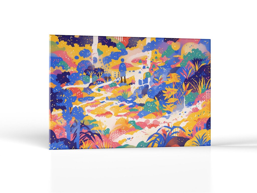 Obraz predstavuje osobu stojacu v centre pestrofarebnej a energickej záhrady plnej abstraktných, grafických elementov, ktoré pripomínajú rastliny a kvety. Hra farieb a tvarov vytvára živý a dynamický obraz, ktorý vyvoláva pocit radosti a fantázie. Záhrada je plná rôznych vzorov a štruktúr, čo dodáva dielu bohatú textúru a hĺbku.