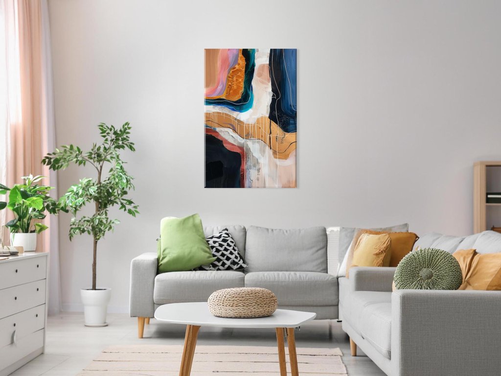 Tento obraz zobrazuje živé farebné prechody, ktoré plynule splývajú a tvoria dynamickú kompozíciu. Textúrované vrstvy farieb pridávajú hĺbku a zaujímavé detaily, ktoré zachytávajú pohľad diváka. Kombinácia teplých a chladných tónov spolu s bielymi líniami vytvára harmonický a vyvážený celok, ktorý evokuje pocit pohybu a energie.
