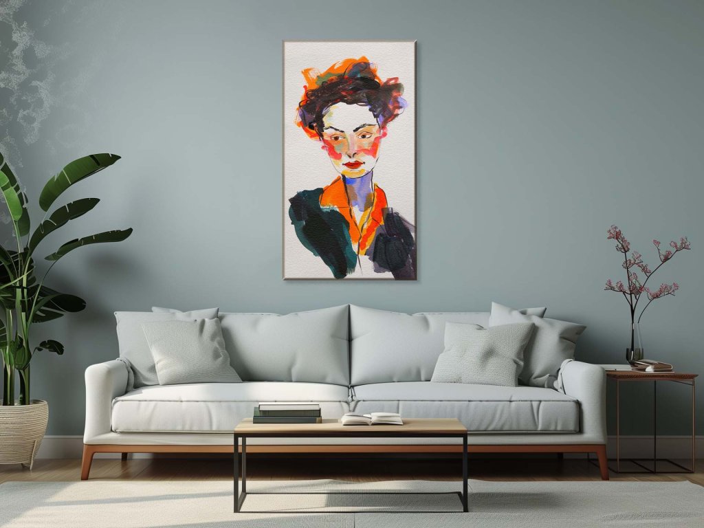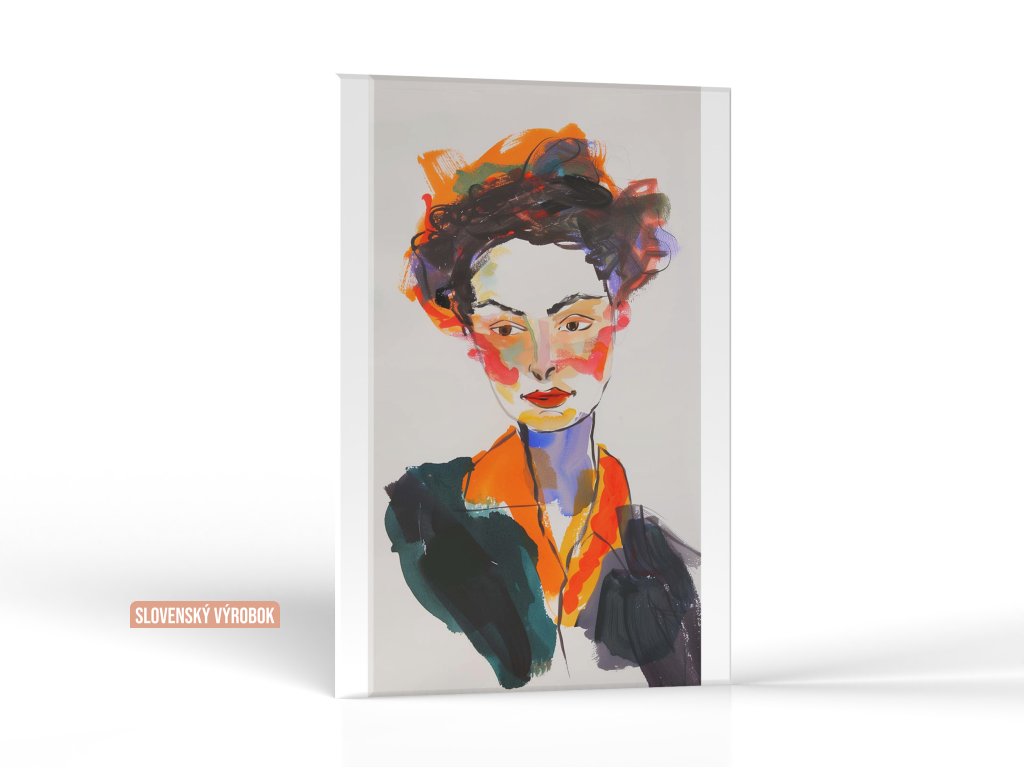 Tento obraz predstavuje ženu s výraznými črtami tváre, akcentovanými výraznými farbami a odvážnymi ťahmi štetca. Použitie intenzívnych oranžových a modrých odtieňov prináša do portrétu živelnosť a dynamiku. Výtvarná kompozícia spája prvky realistického zobrazenia a abstrakcie, čím vytvára dojem silnej emocionálnej výpovede.