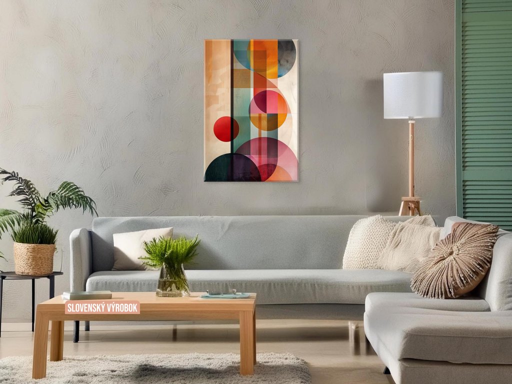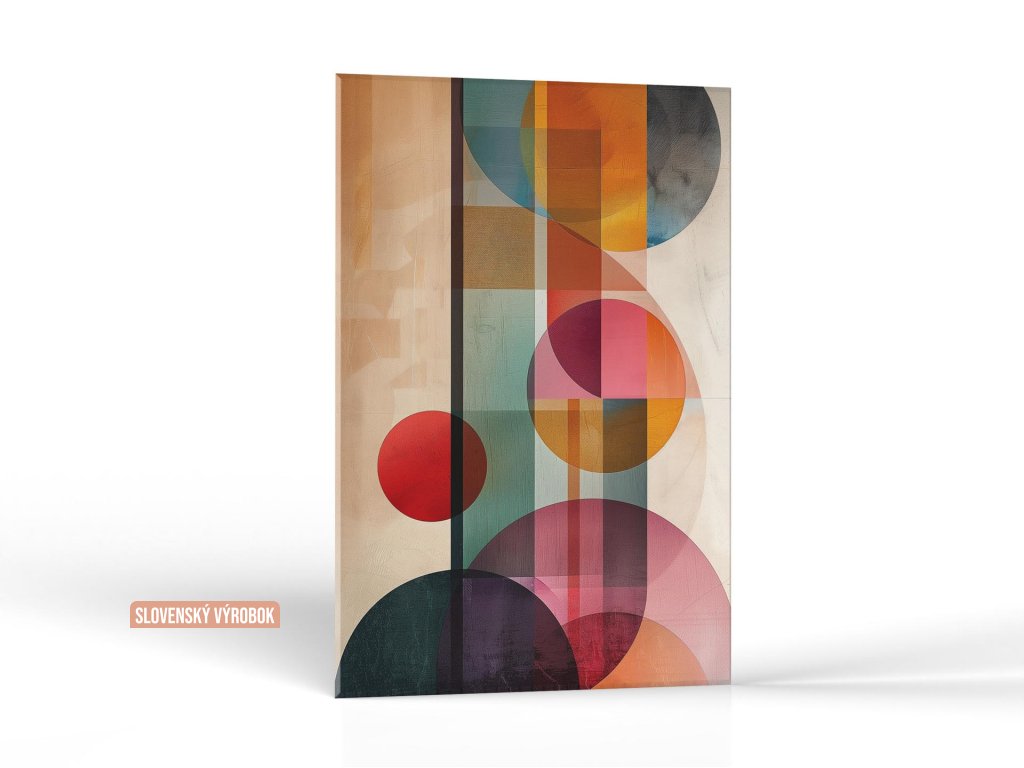 Tento obraz zobrazuje zaujímavú hru farebných kruhov a obdĺžnikov, ktoré sa prelínajú a vytvárajú harmóniu farieb a tvarov. Rôzne odtiene červenej, oranžovej, modrej a zelenej dodávajú obrazu živý a dynamický charakter. Kompozícia pôsobí moderne a esteticky príjemne, lákajúca diváka k hlbšiemu zamysleniu a interpretácii.