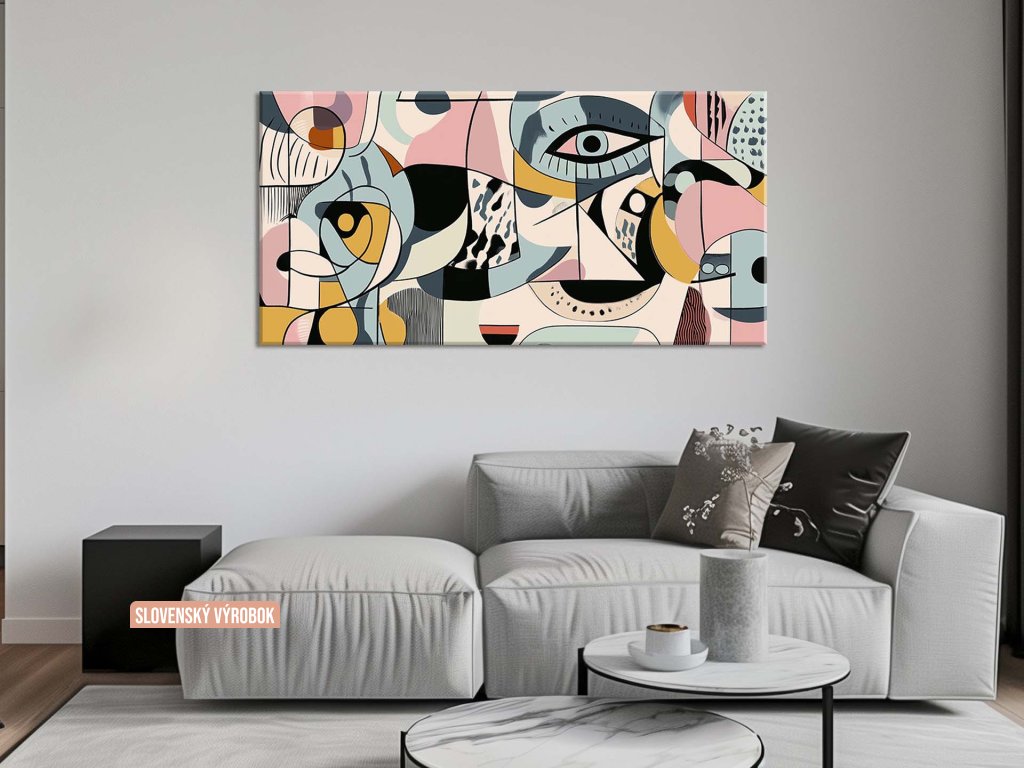 Tento obraz kombinuje rôzne abstraktné tvary, krivky a línie, ktoré vytvárajú ilúziu očí a tvárí, pričom každá časť zaujme svojou farebnou harmóniou. Kombinácia pastelových tónov s tmavými čiarami dodáva obrazu jedinečnú rovnováhu medzi jemnosťou a kontrastom. Celkový dojem vyvoláva pocit abstraktného rozprávania, ktoré necháva priestor na individuálnu interpretáciu a vnímanie.