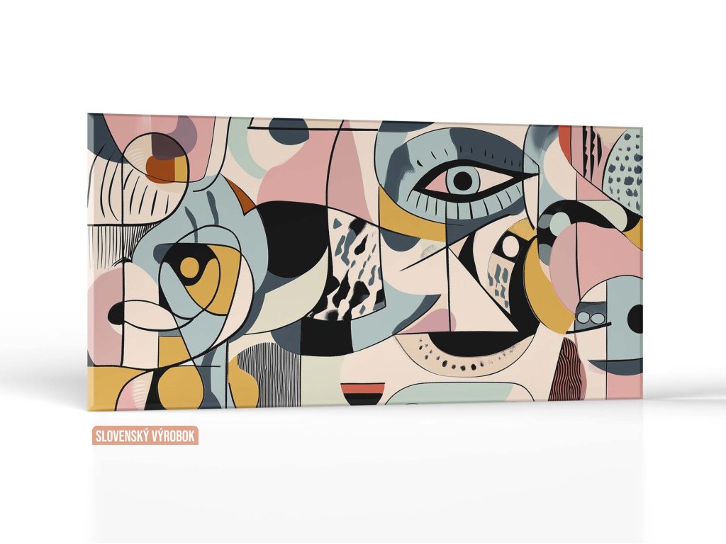 Abstraktná kompozícia tvarov a farieb vytvára obraz plný vizuálnej dynamiky a tajomných pohľadov.
