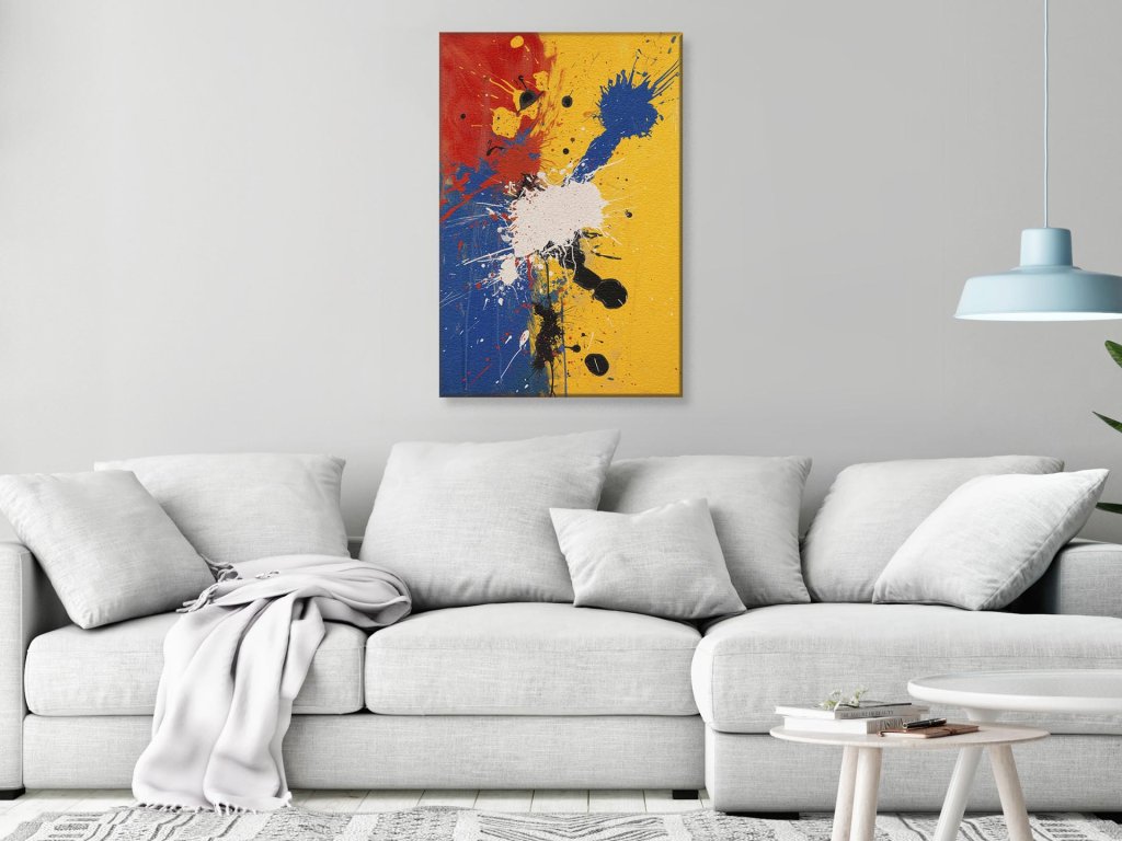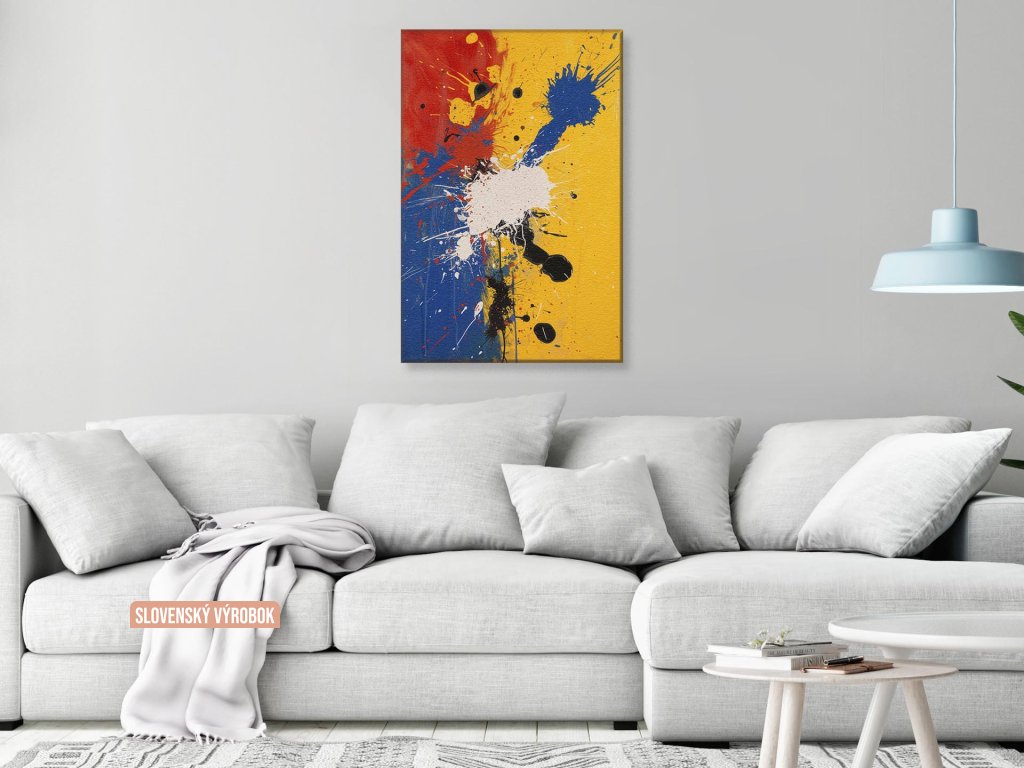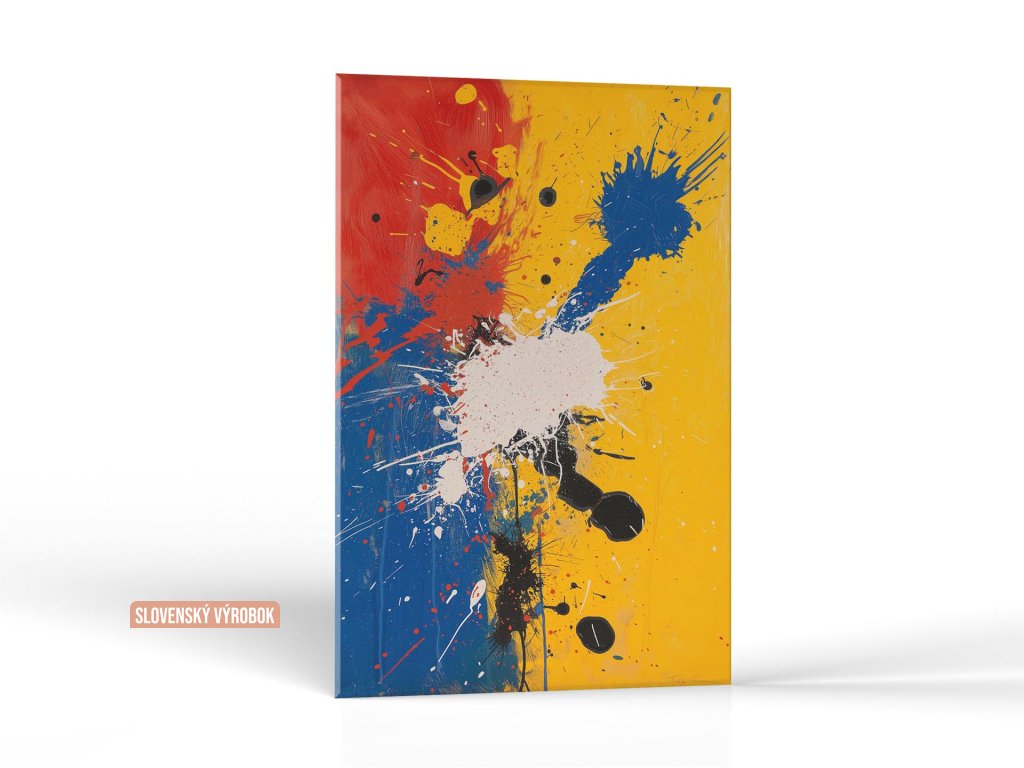Tento obrázok ukazuje živé pruhy a škvrny žltej, červenej, modrej a čiernej farby na svetlom pozadí, ktoré vytvárajú dojem pohybu a energie. Výrazné kvapky a striekance farby dodávajú kompozícii hlboký vizuálny rozmer a textúru. Celkový efekt je veľmi dynamický a môže pripomínať explóziu alebo energickú hudobnú kompozíciu.