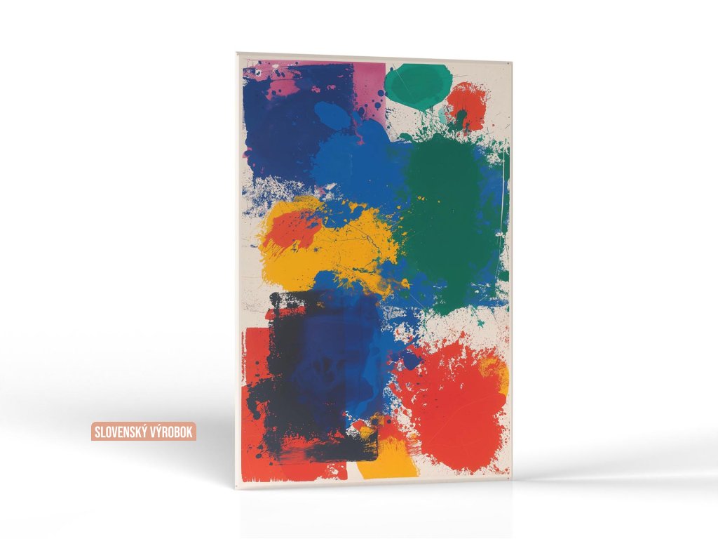 Obrázok ukazuje abstraktnú maľbu s dominujúcimi modrými, červenými, žltými a zelenými rozstrekmi na bielom pozadí. Kompozícia pôsobí dynamicky a hravo, pričom každá farba prispieva k celkovému energickému dojmu. Zdá sa, akoby boli farby náhodne rozhádzané, čo dodáva dielu spontánnu a nekontrolovanú atmosféru.