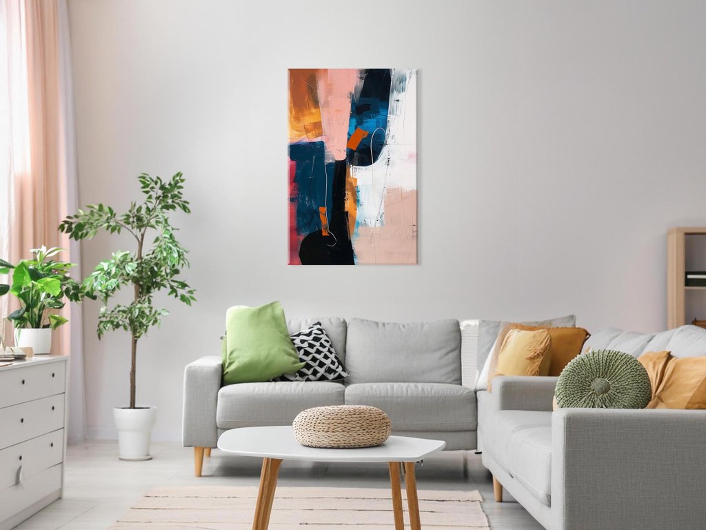 Tento abstraktný obraz vyniká svojimi výraznými farebnými prechodmi, ktoré vytvárajú zaujímavý vizuálny efekt. Kontrastné odtiene a textúry dodávajú obrazu hĺbku a dynamiku, pričom jemné línie a detaily pridávajú na komplexnosti. Celkový dojem z obrazu je moderný a energický, čo priťahuje pohľady a podnecuje predstavivosť.