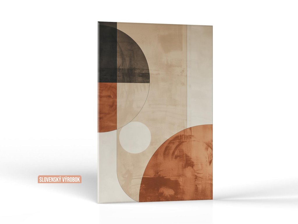 Tento abstraktný obraz využíva geometrické tvary, ako sú kruhy a obdĺžniky, ktoré sa prelínajú a dopĺňajú. Teplé odtiene oranžovej, hnedej a béžovej pridávajú obrazu pocit hrejivosti.