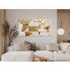 Abstraktná kompozícia zlatých a bielych geometrických tvarov v sofistikovanom usporiadaní.