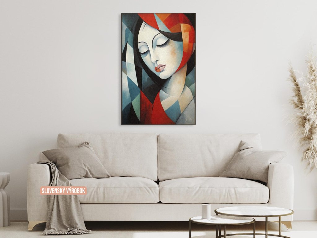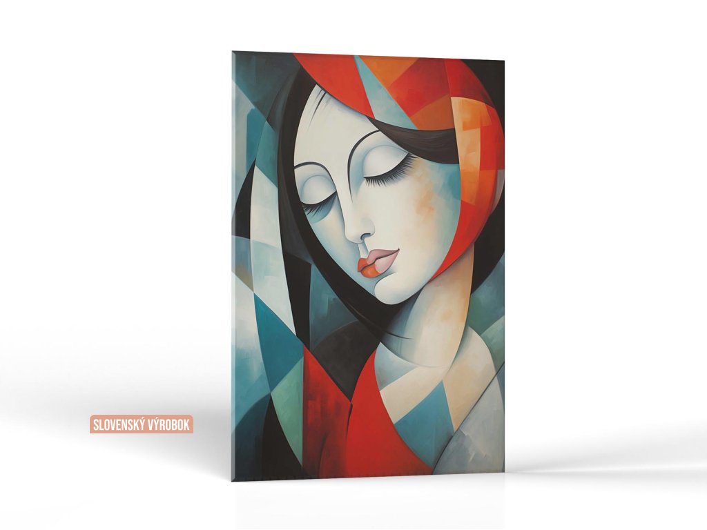 Portrét ženy v štýle kubizmu s výraznými geometrickými tvarmi.