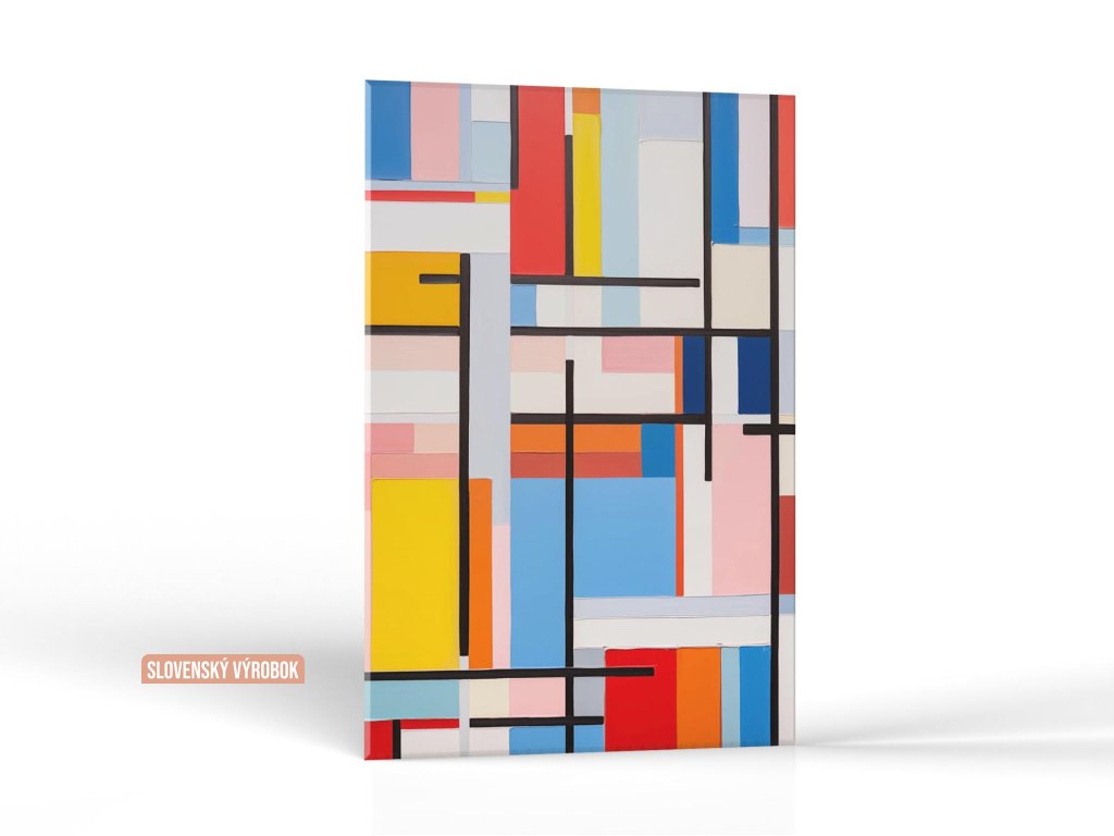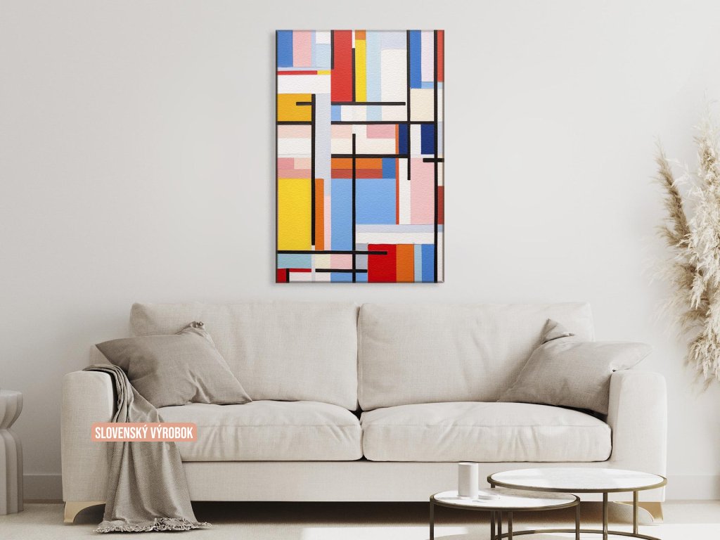 Obraz je vizuálnym zoskupením pravouhlých blokov v rôznych pastelových a živých farbách, oddeľovaných čiernymi čiarami. Kompozícia vytvára rytmickú a farebnú harmóniu, ktorá je príjemná pre oko. Je to moderná práca, ktorá sa môže interpretovať ako štúdia farieb a tvarov.
