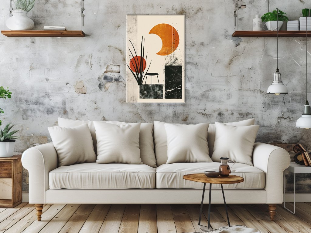 Tento obraz predstavuje modernú abstraktnú kompozíciu, kde dominujú geometrické tvary a čisté línie. Na obrázku sú zobrazené dva veľké oranžové kruhy, ktoré sú v kontraste s čiernymi a sivými geometrickými prvkami. Jemné prvky rastliny pridávajú obrazu prírodný dotyk, zatiaľ čo celkovo farebná paleta vytvára vyvážený a pokojný vizuálny zážitok.