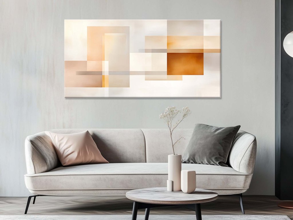 Tento obraz využíva medzi jednoduchými geometrickými tvarmi a jemnými farebnými prechodmi. Paleta neutrálnych tónov v kombinácii s oranžovými akcentmi vytvára príjemný zážitok. Dielo svojou abstraktnou kompozíciou pozýva diváka k zamysleniu a dodáva priestor moderný a sofistikovaný nádych.