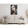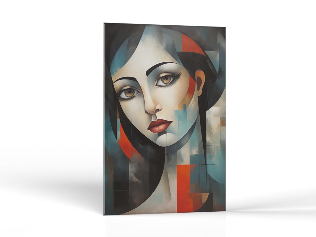 Tento obraz zobrazuje tvár ženy, ktorá je štylizovaná do série geometrických tvarov a blokov farieb, vytvárajúc tak moderný a abstraktný výraz. Jej oči a pery sú zvýraznené, čím sa na nich udržuje pozornosť, zatiaľ čo zvyšok jej tváre a vlasy sú rozdelené do segmentov s hladkými prechodmi a ostrými líniami. Dominujúce farby sú čierna, šedá, oranžová a modrá, čo pridáva na dramatickosti a vizuálnej atraktivite.