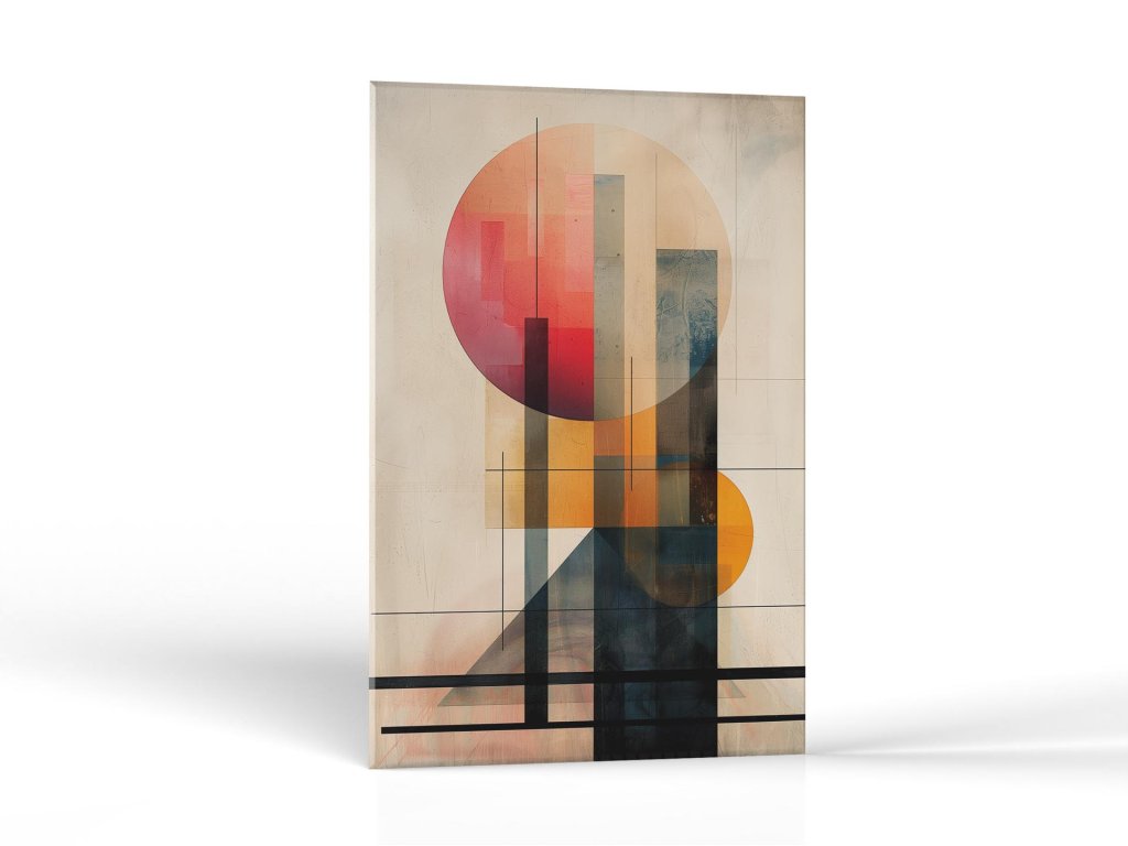 Tento abstraktný obraz kombinuje rôzne geometrické tvary, ako sú kruhy a obdĺžniky, v teplých odtieňoch červenej a oranžovej, ktoré kontrastujú so studenými odtieňmi modrej a šedej. Farby a tvary sa navzájom prelínajú a vytvárajú harmonickú kompozíciu plnú vizuálneho záujmu. Línie a textúry dodávajú obrazu dynamiku a hĺbku, čím podnecujú divákovu predstavivosť a interpretáciu.
