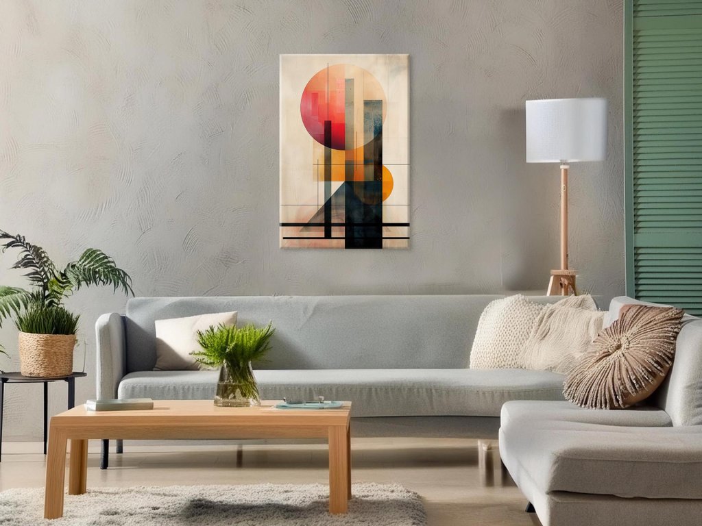 Tento abstraktný obraz kombinuje rôzne geometrické tvary, ako sú kruhy a obdĺžniky, v teplých odtieňoch červenej a oranžovej, ktoré kontrastujú so studenými odtieňmi modrej a šedej. Farby a tvary sa navzájom prelínajú a vytvárajú harmonickú kompozíciu plnú vizuálneho záujmu. Línie a textúry dodávajú obrazu dynamiku a hĺbku, čím podnecujú divákovu predstavivosť a interpretáciu.