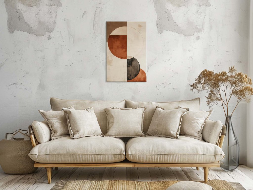 Tento obraz zobrazuje rôzne kruhové a polkruhové tvary v teplých odtieňoch hnedej a béžovej farby, ktoré sa navzájom prekrývajú a vytvárajú harmonický kontrast. Jemné prechody medzi farbami dodávajú obrazu hĺbku a textúru, pričom zachovávajú jeho minimalistický štýl. Celkový dojem obrazu je pokojný a vyvážený, čo ho robí ideálnym doplnkom pre moderné interiéry.