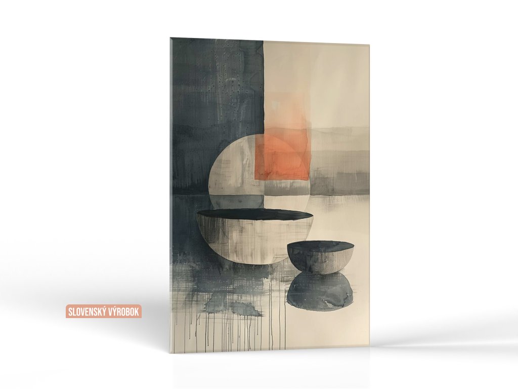 Na obraze sú zobrazené rôzne abstraktné formy, ako kruhy a štvorce, v mäkkej palete šedej, čiernej a teplej oranžovej. Tmavé kvapky z dolnej časti tvarov dodávajú kompozícii pohybový a textúrny rozmer. Celkový efekt je minimalistický a zameraný na rovnováhu a kontrast medzi tvrdými líniami a mäkkými odtlačkami farieb.
