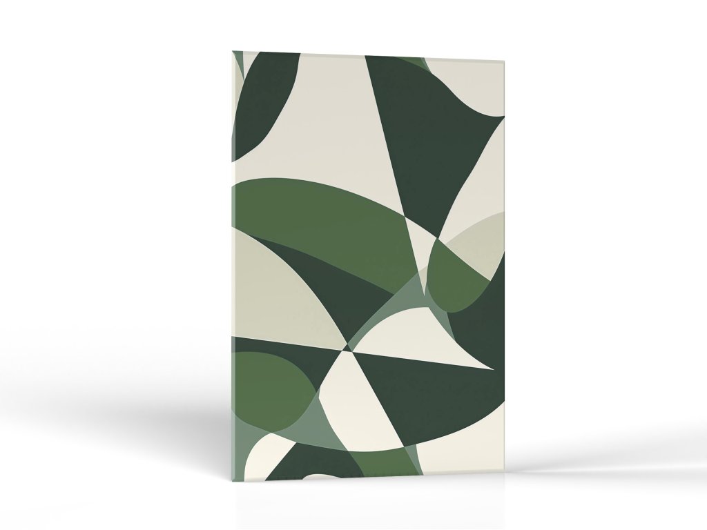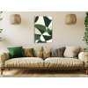Na tomto abstraktnom obraze sa preplieta zmes temnej a svetlej zelenej v jednoduchých, ale efektných geometrických tvaroch. Plynulé línie a krivky vytvárajú pohľad, ktorý pripomína prirodzené prvky, akoby boli listy alebo vlny. Vzor je umiestnený na krémovobielom pozadí, čo umocňuje kontrast a dodáva obrazu čistý a moderný vzhľad.