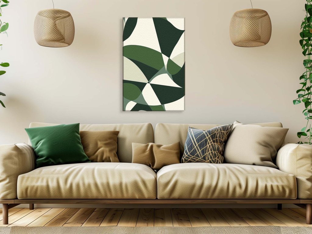 Na tomto abstraktnom obraze sa preplieta zmes temnej a svetlej zelenej v jednoduchých, ale efektných geometrických tvaroch. Plynulé línie a krivky vytvárajú pohľad, ktorý pripomína prirodzené prvky, akoby boli listy alebo vlny. Vzor je umiestnený na krémovobielom pozadí, čo umocňuje kontrast a dodáva obrazu čistý a moderný vzhľad.