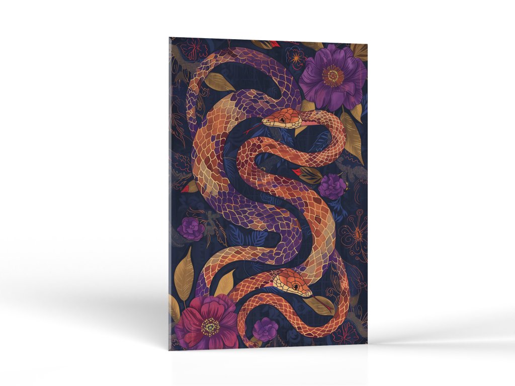 Na tomto obraze je zobrazený had s bohato vzorovanou šupinatou pokožkou v teplých odtieňoch oranžovej a červenej, ktorý sa vinie cez tmavomodré pozadie zdobené kvetmi a ornamentmi. Výrazná kontrastná farba hada a pozadia vytvára hĺbku a pôsobivý vizuálny efekt. Detailné zobrazenie kvetov a ornamentov na pozadí dodáva kompozícii exotický a tajomný vzhľad.