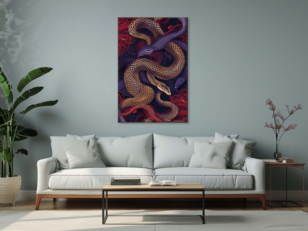 Na obrázku sú dva hady s detailne vypracovanou šupinatou textúrou, ktorých telá sa dynamicky preplietajú v centrálnom motíve. Tmavé pozadie s červenými a zlatými ornamentmi podčiarkuje mystickú a záhadnú atmosféru. Farby a štruktúra hadov vytvárajú kontrast, ktorý zvýrazňuje ich eleganciu a plynulý pohyb.