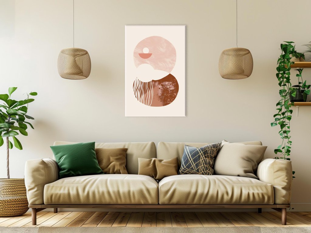 Tento obraz predstavuje harmonickú kompozíciu abstraktných kruhov v teplých pastelových farbách, ktoré vytvárajú jemný a upokojujúci vizuálny dojem. Každý kruh má odlišnú textúru a vzor, čo dodáva obrazu hĺbku a zaujímavosť. Celkový dizajn je minimalistický, avšak výrazný, čo robí tento obraz vhodným doplnkom pre moderné interiéry.